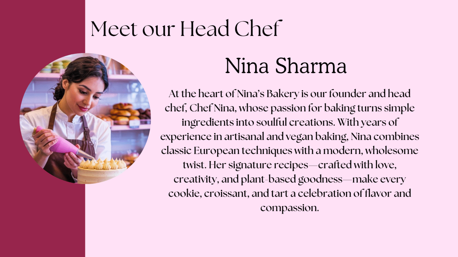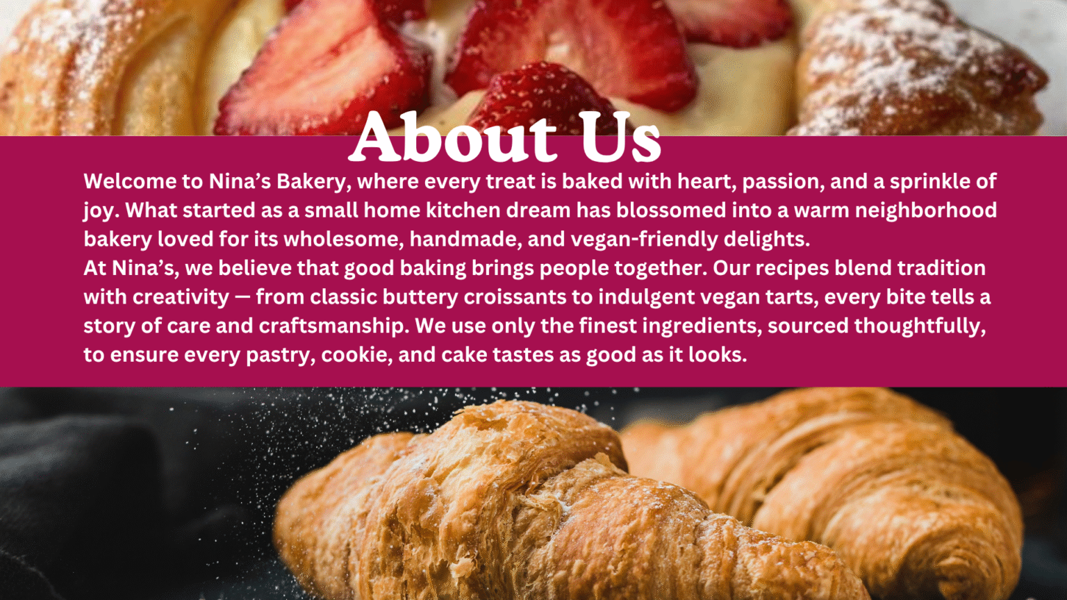 Whisk. Bake. Smile. VEGAN TARTSDelightfully crisp tarts filled with plant-based goodness and fresh flavors.Buy Now FLUFFY BUNSSoft, fluffy buns and perfect for a playful sweet treat.Buy Now Mini Cake with CoffeeA bite-sized indulgence paired perfectly with a warm cup of coffee.Buy Now Popular Items Our Bakery at a Glance Kind Words from You Sofia@soffiaaa βAbsolutely delightful treats β fresh, flavorful, and baked with love!β queen@queen08 βEvery bite feels homemade β soft, buttery, and simply irresistible!β Reyansh @rey02ansh βA cozy bakery that turns everyday cravings into sweet little moments.β Contact us Contact Us Name * First Last * Last Email * Phone Interested in * Ordering cakes Customising cakes Baking Classes Other Queries Submit If you are human, leave this field blank. Β